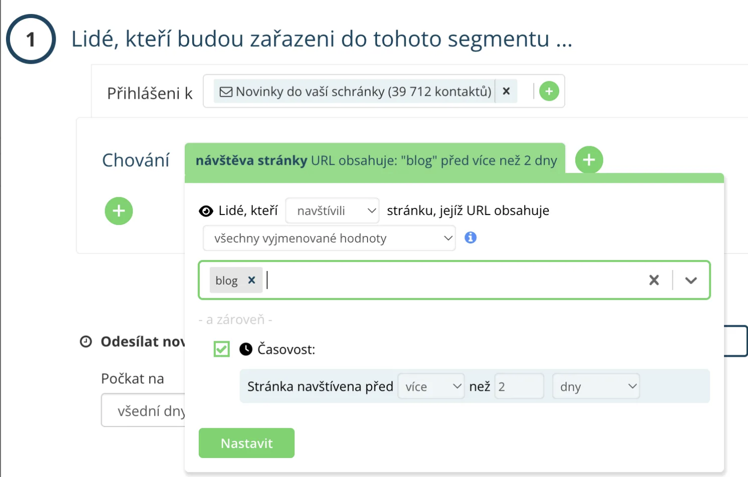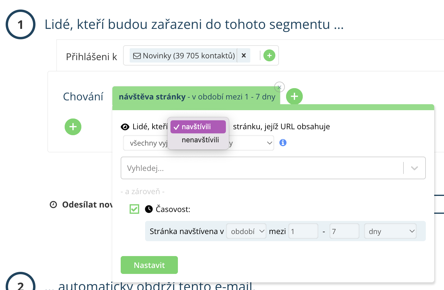 - zvolte časové období, kdy byla stránka navštívená (podle té se také bude odesílat automatický e-mail z kampaně, pokud nejsou zvolena žádná další segmentační pravidla)