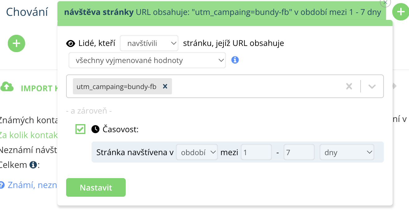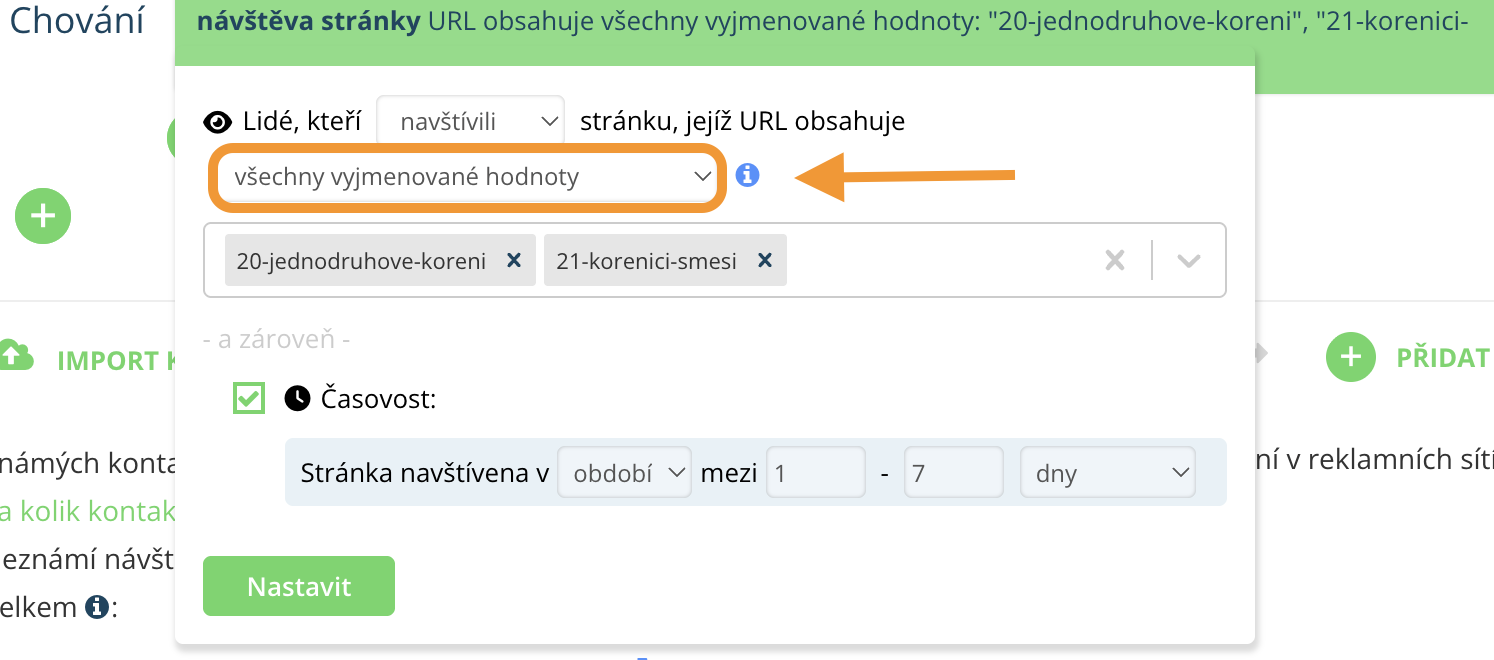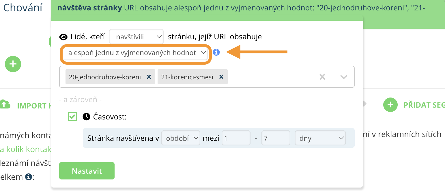 Při tvorbě publika si pak můžete vybrat, zda chcete zahrnout všechny kontakty, které navštívily alespoň jednu z uvedených stránek / UTM parametrů, nebo naopak jen ty kontakty, které v minulosti navštívily všechny vyjmenované stránky / UTM parametry.