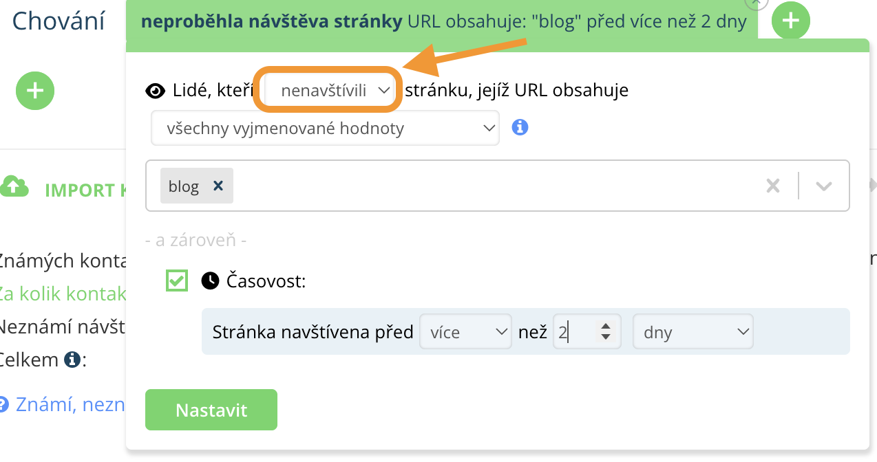 Díky segmentačnímu pravidlu pro navštívené stránky můžete cílit podle URL a UTM parametrů na kontakty podle toho, které stránky na webu navštívili, nebo se na něj naopak nedostaly.