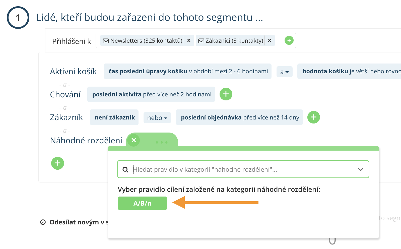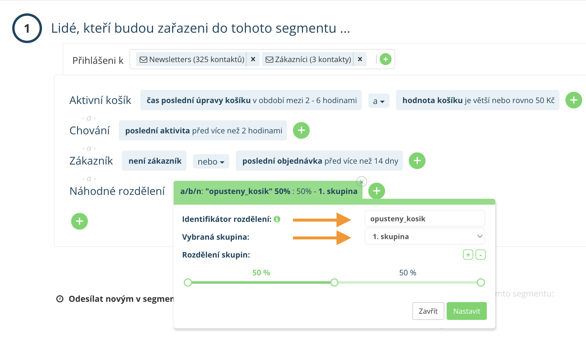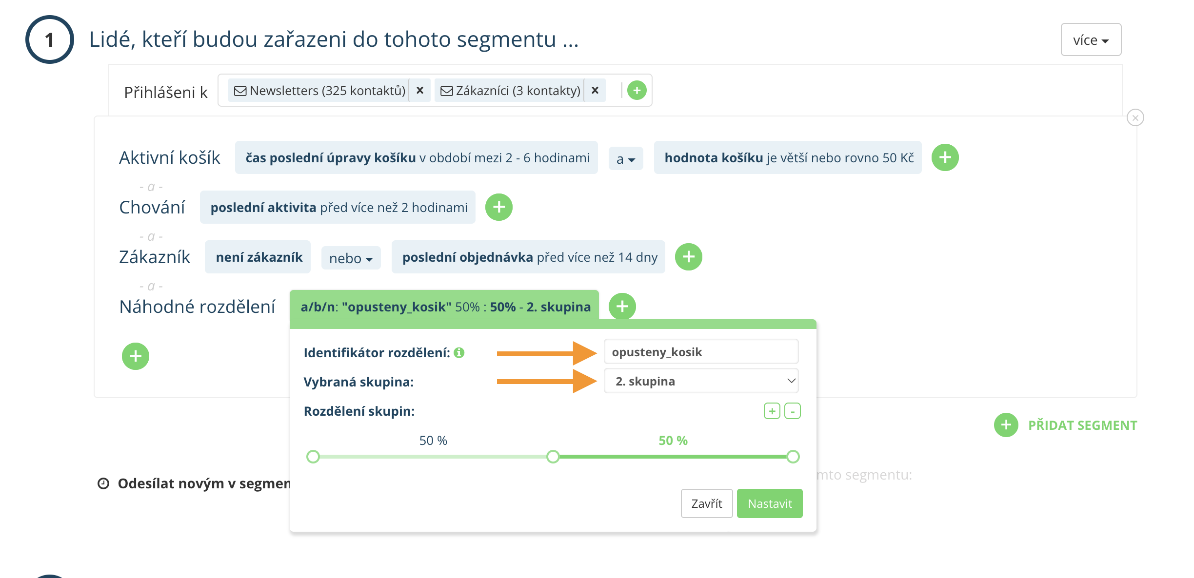 Připravte si dvě verze e-mailu pro kampaň Opuštěný košík – například jednu s oslovením v předmětu a druhou bez něj. Nastavte cílení kampaně, přidejte segmentační pravidlo „náhodné rozdělení“ a zvolte pravidlo A/B/n.