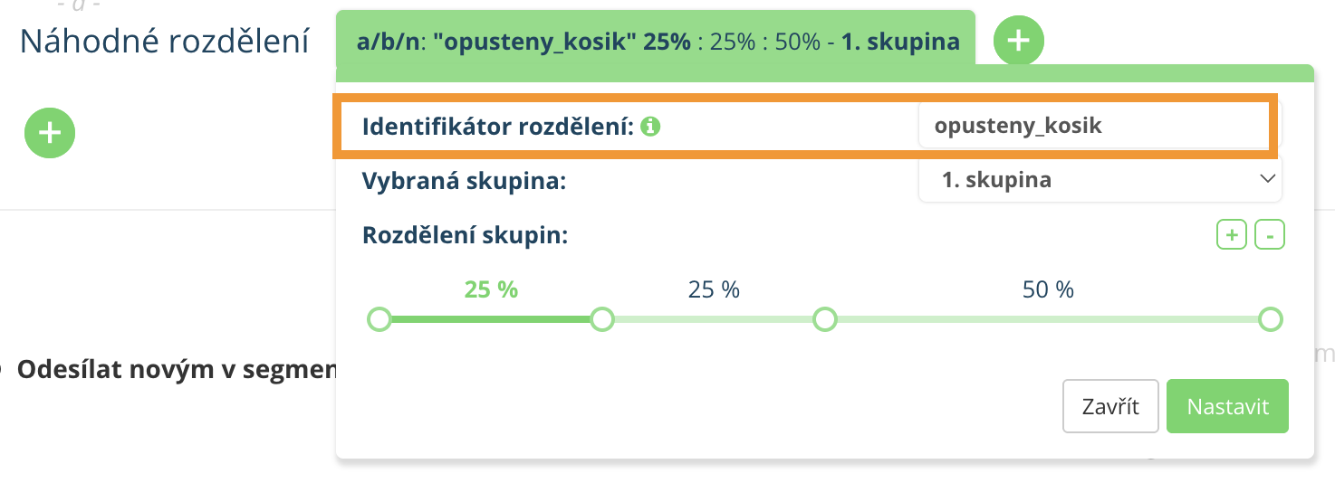Jako první je třeba vyplnit pole „Identifikátor rozdělení“. Tento identifikátor musí být ve všech testovacích verzí e-mailů totožný. Identifikátor můžete být například: „opusteny_kosik“.