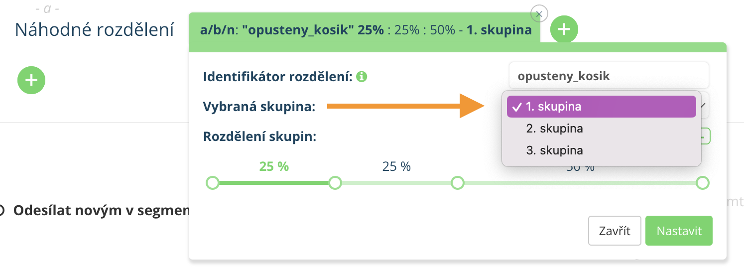 Krok č. 5 Ve druhé verzi to bude podobné. Vyplníte totožný identifikátor rozdělení jako v první kampani (např. opusteny-kosik). A v sekci „vybraná skupina“ zvolíte druhou skupinu (2. skupina).