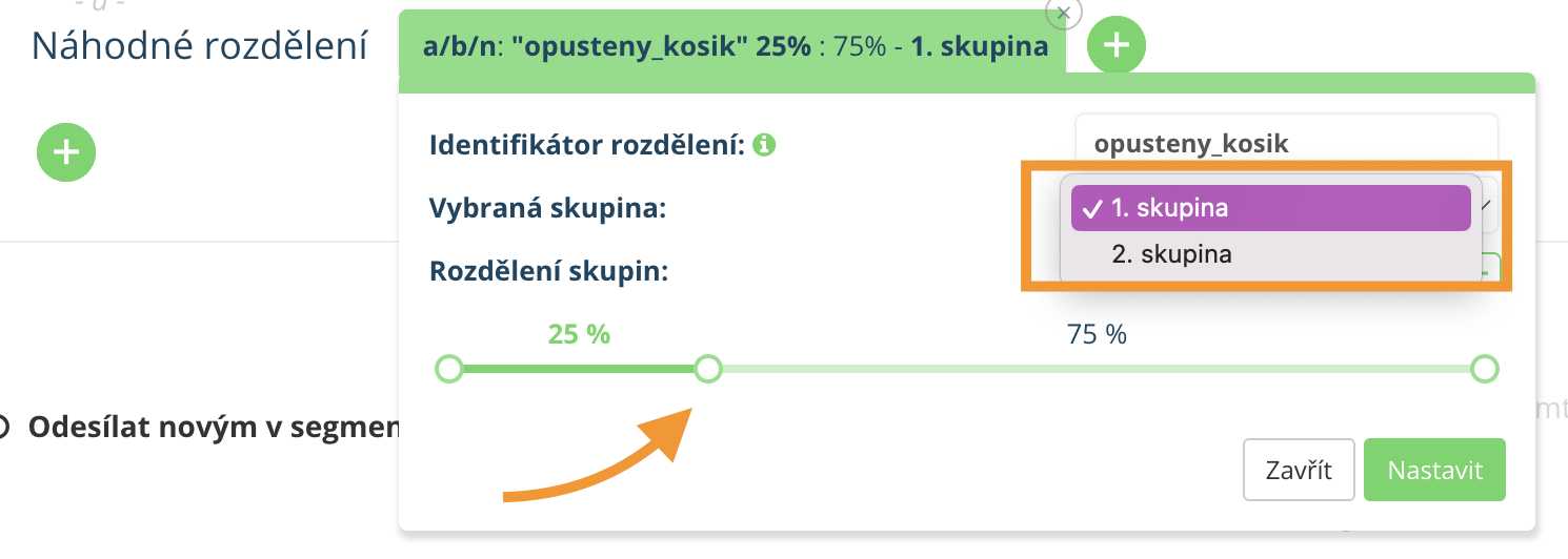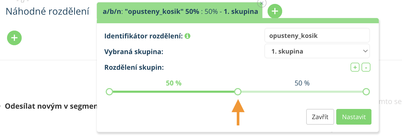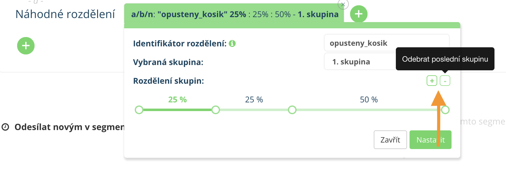 Krok č. 3b Pokud chcete testovat pouze dvě skupiny, klikněte na minus, jak je naznačeno na ukázce výše. Poté budete moci tahem myši upravit procentuální rozložení těchto dvou skupin (např. 50 % a 50 %). Na ose pak vidíte vyznačenou skupinu, kterou máte zvolenou v sekci „vybraná skupina“.