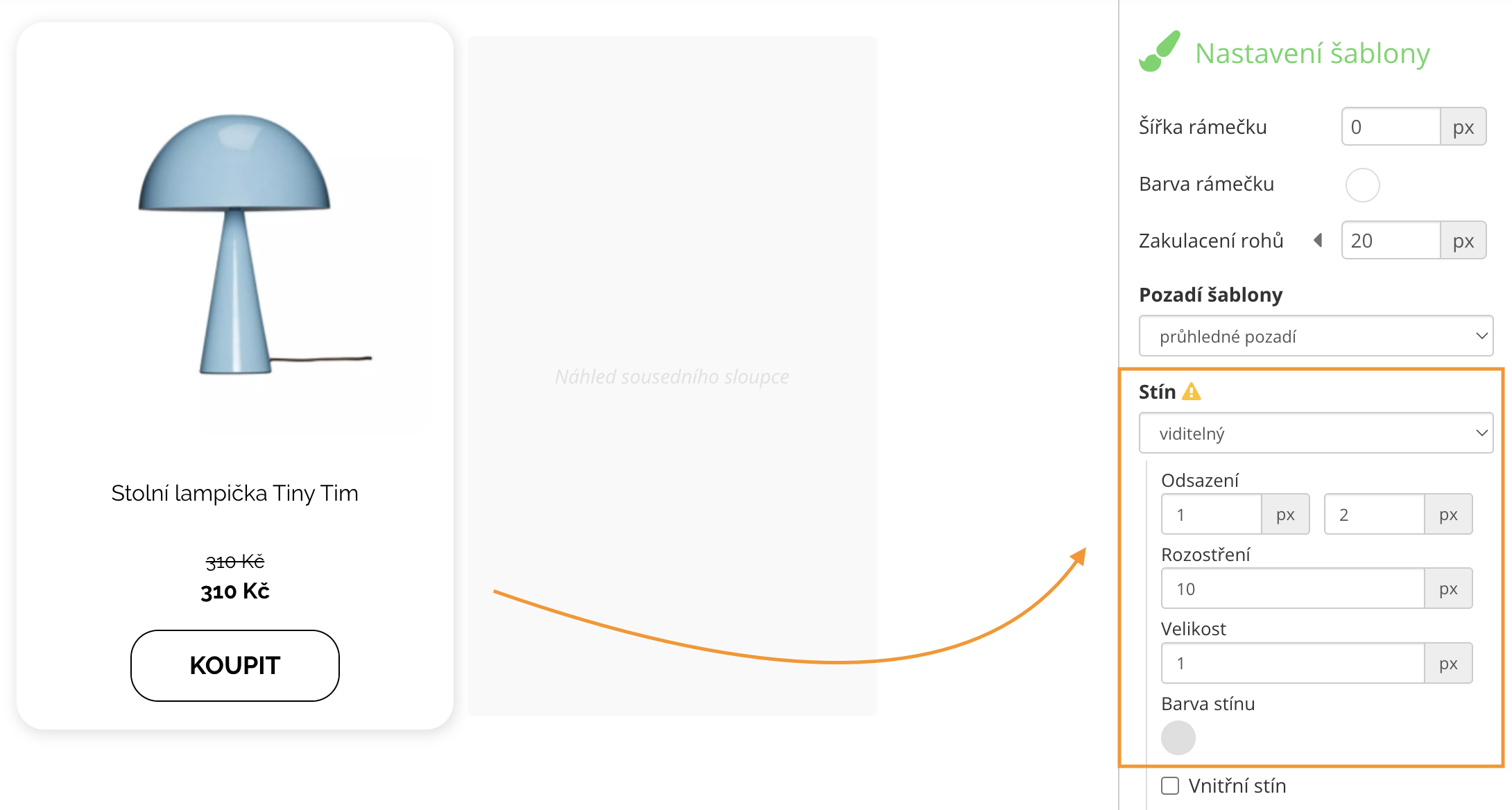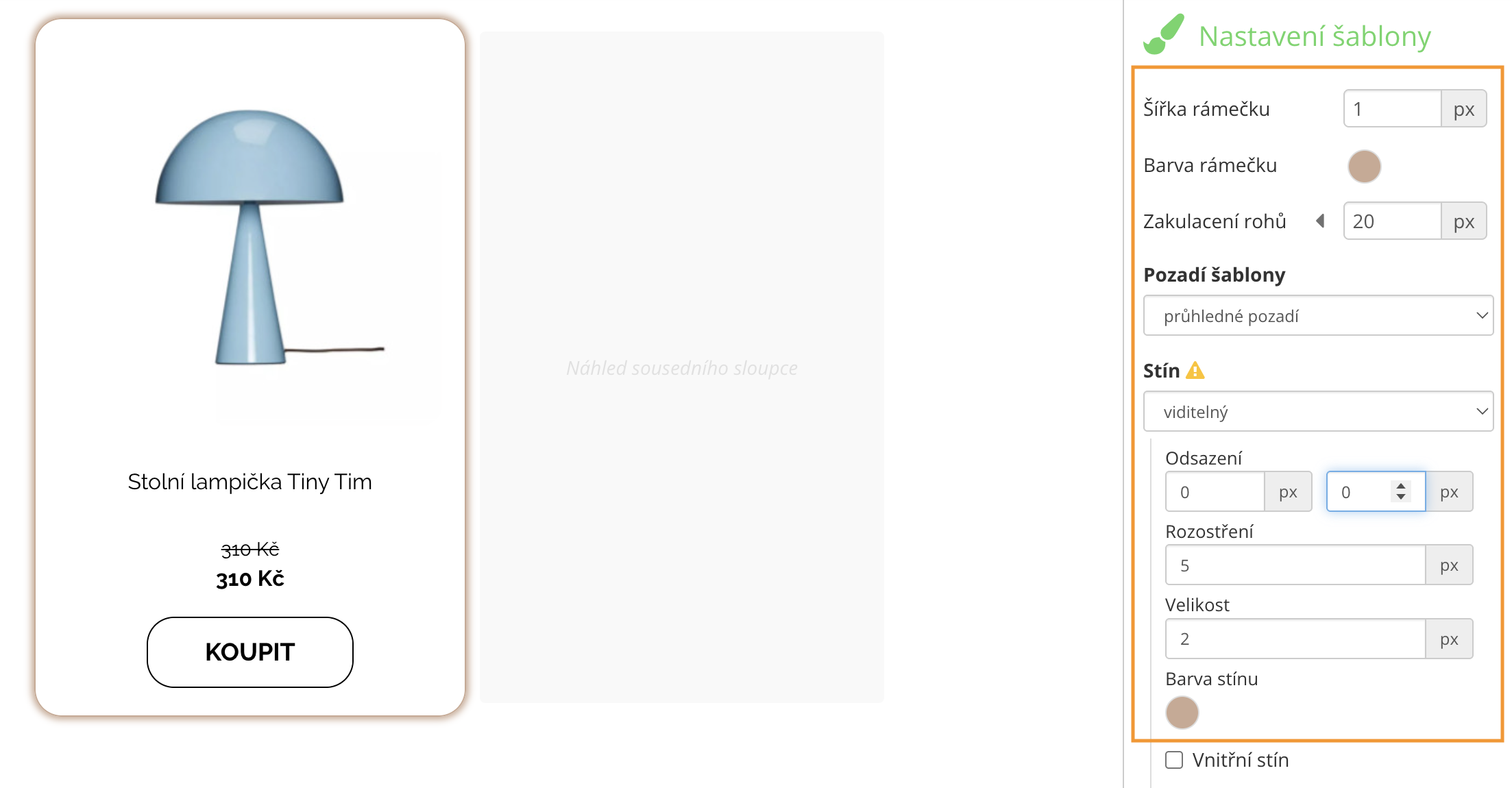 Kromě zakulacení rohů můžete v produktových šablonách nově přidat také stín a rámeček.