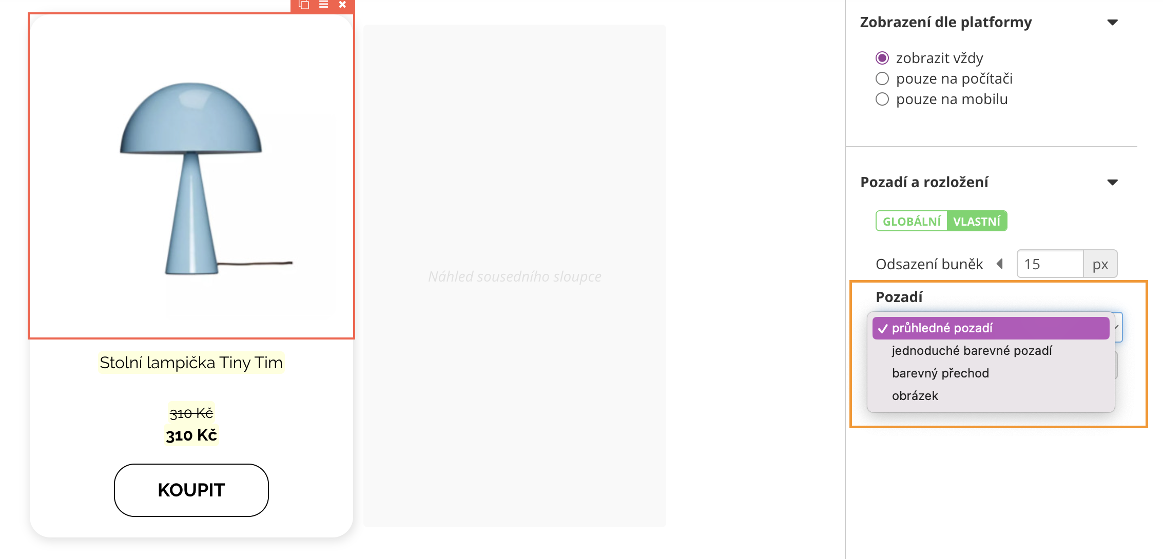 Než vnitřní stín aktivujete, je potřeba u všech bloků (text, produktová fotografie, tlačítko atd.) nastavit průhledné pozadí.