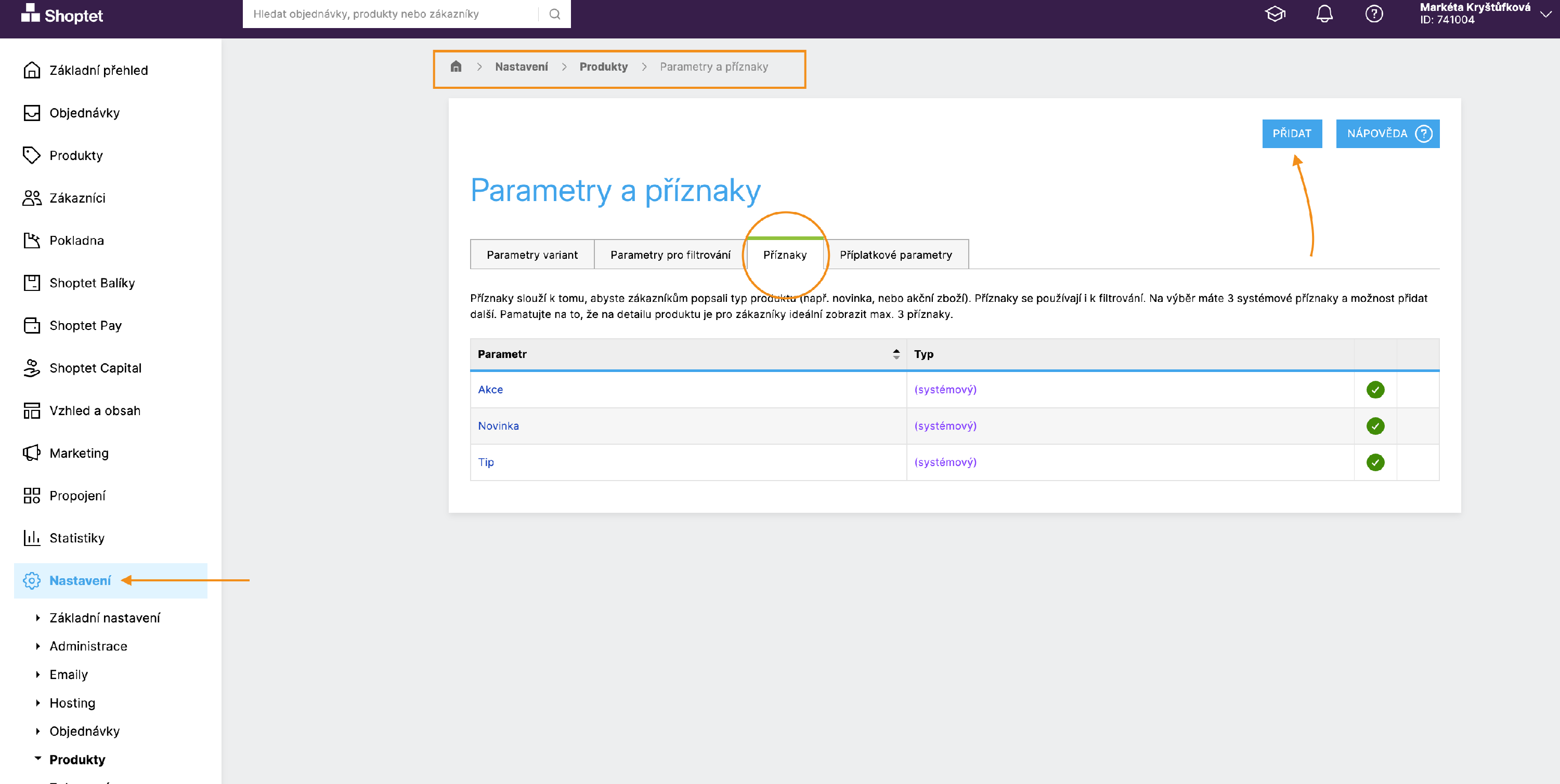 V záložce "Nastavení ➝ Produkty ➝ Parametry a příznaky ➝ Příznaky".