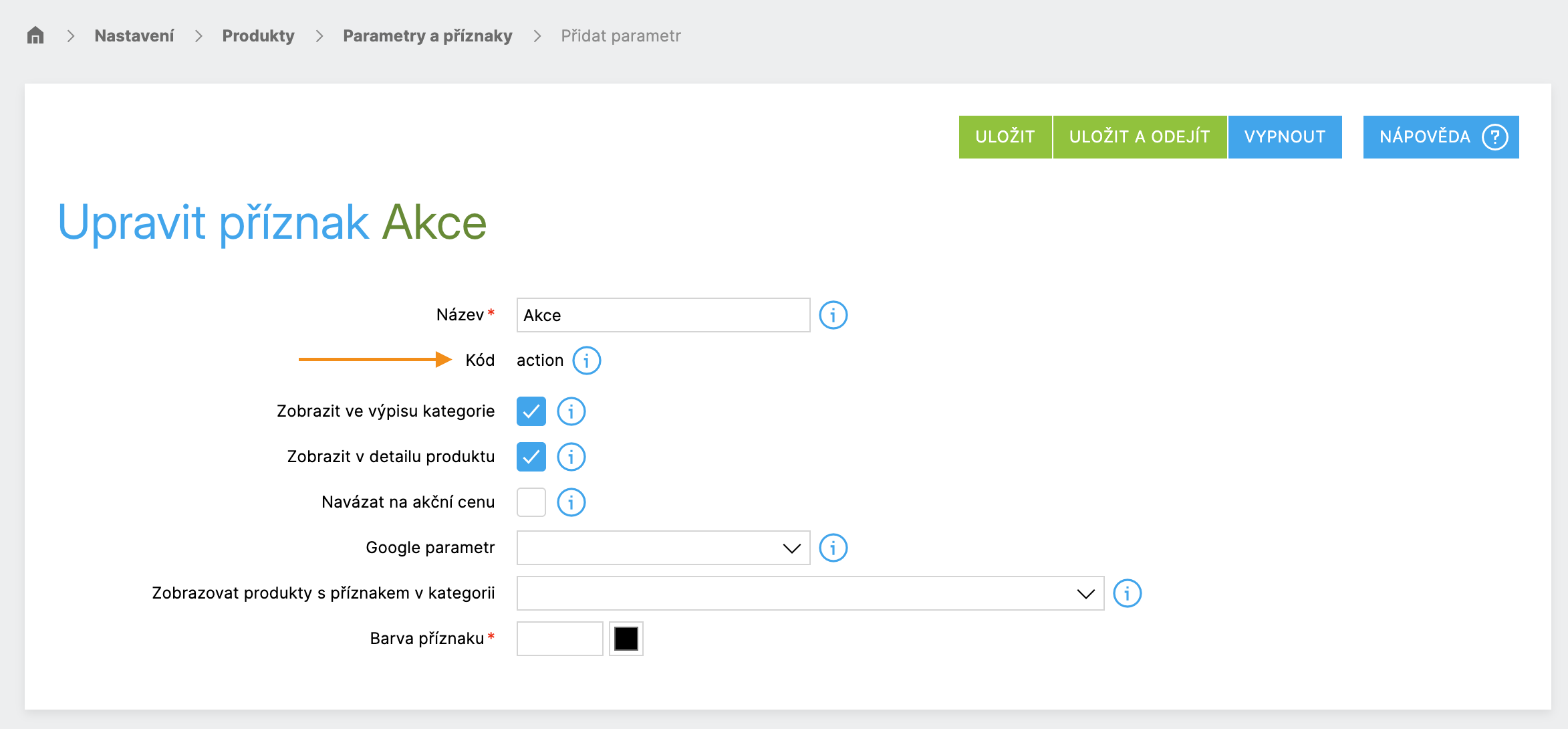 V případě, že chcete do produktové šablony vypsat jeden ze systémových příznaků, přejděte do této nápovědy.