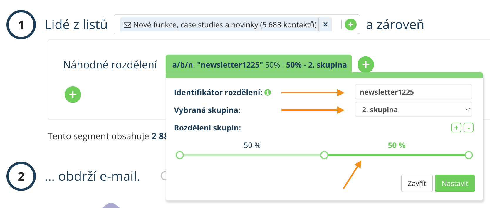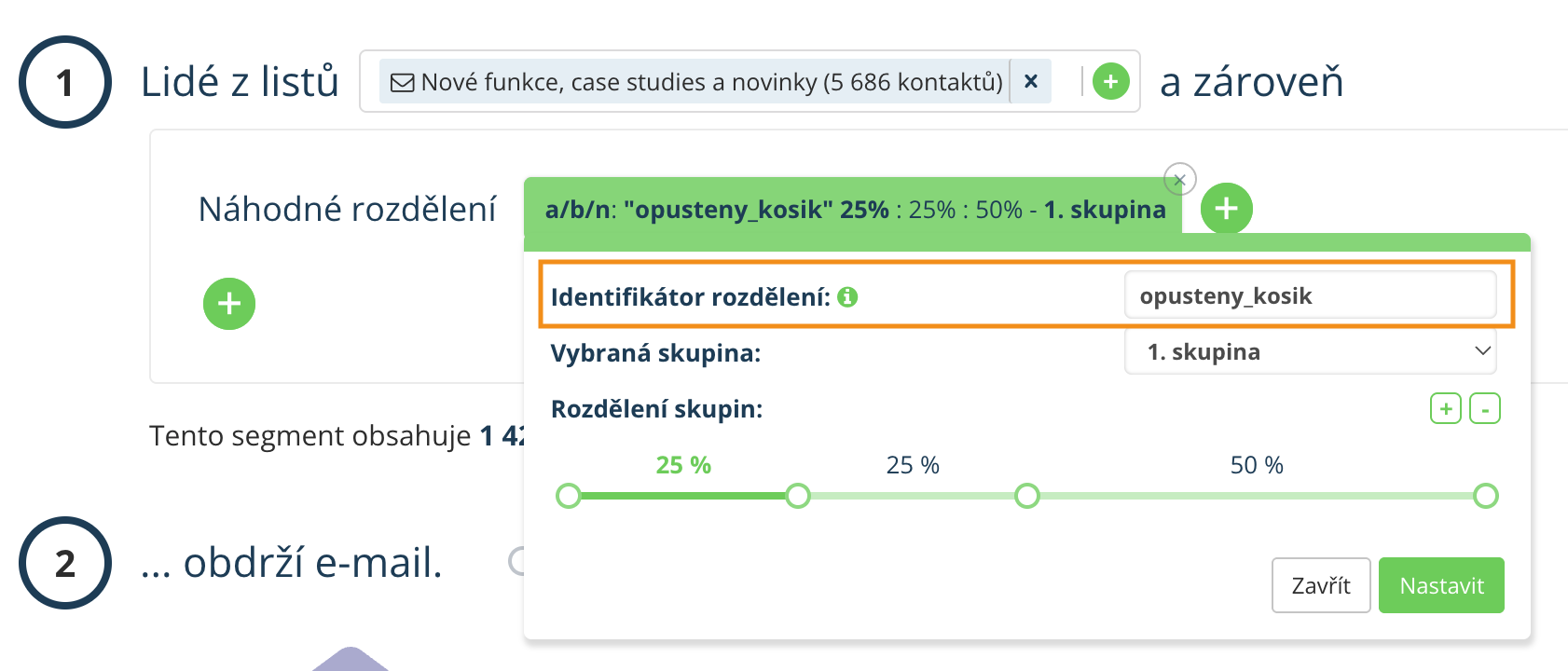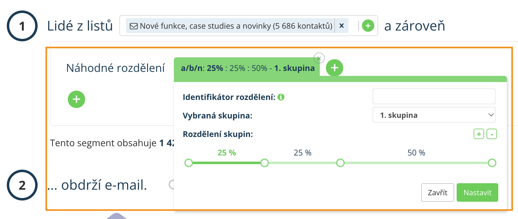 Funkce „Náhodné rozdělení“ umožňuje rozdělit vámi definovaný segment odběratelů do několika skupin v poměru, který si sami nastavíte.