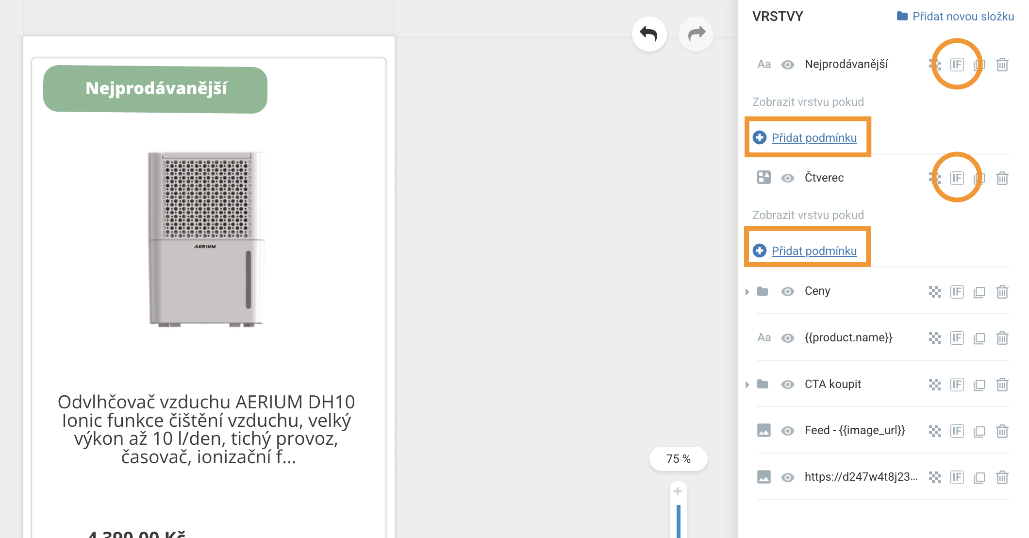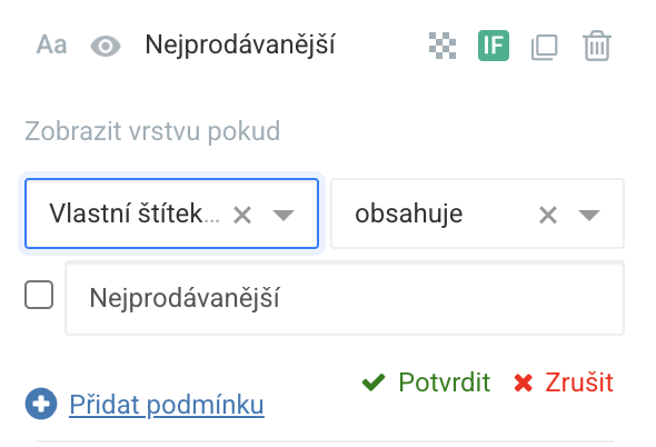 Nyní nastavíme štítku (jak textu, tak objektu obdélník) podmínku, aby se zobrazoval pouze v případě, že produkt obsahuje tento štítek (custom label).