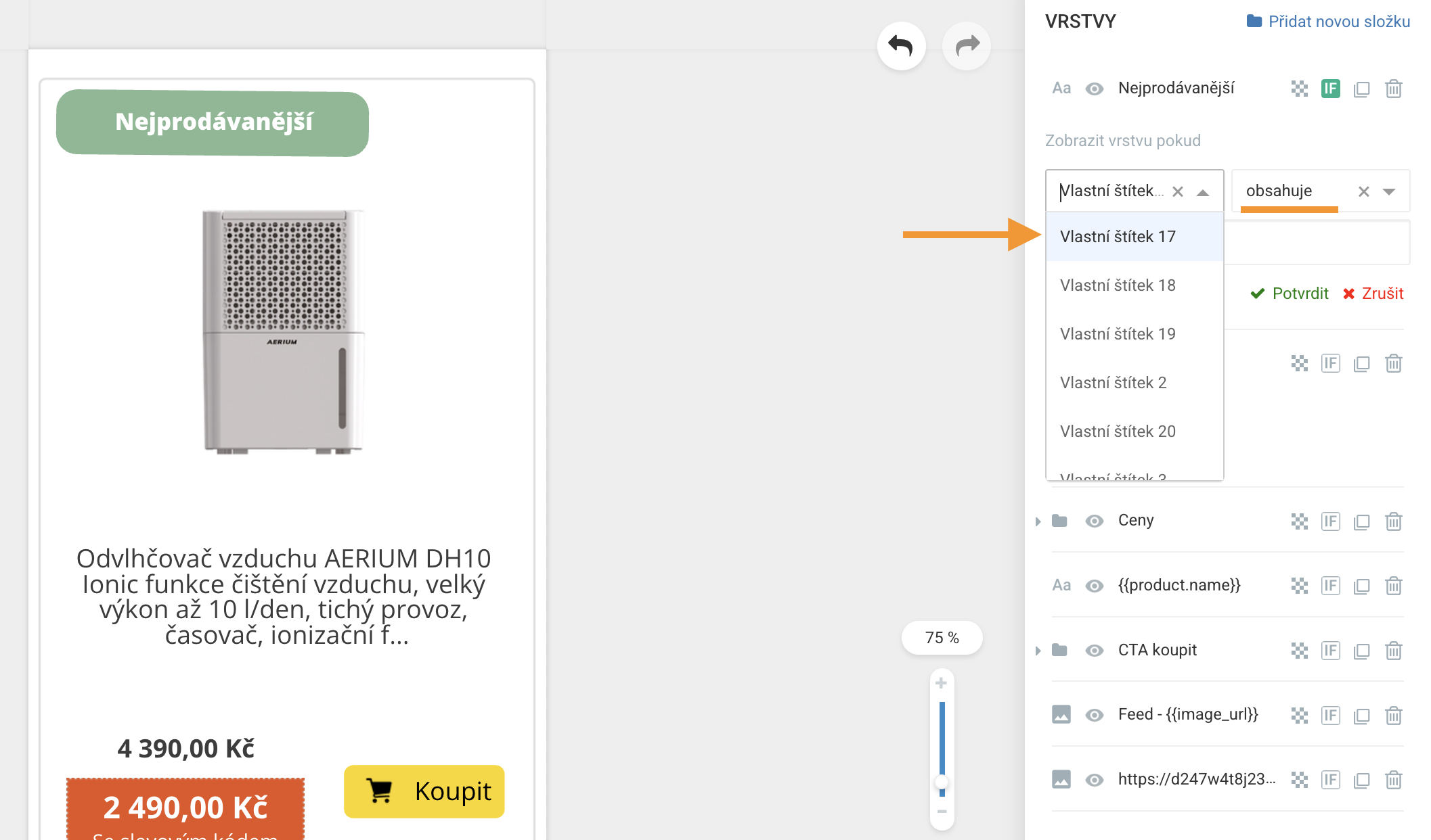 K podmínce přidejte "obsahuje + vložte název štítku (Nejprodávanější)". Podmínku uložte.