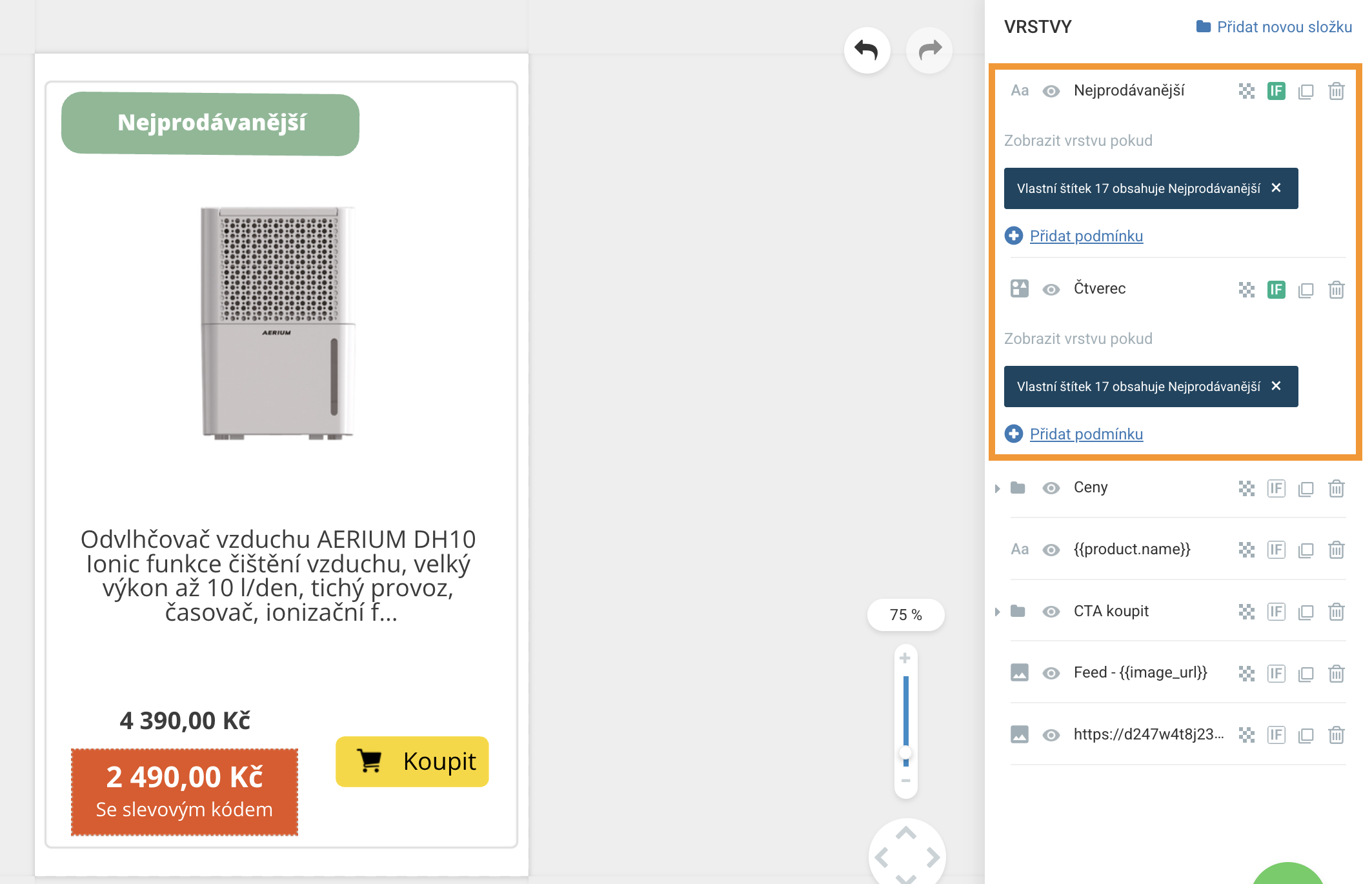 Do podmínek je třeba vložit hodnotu "Vlastní štítek X (kdy X je právě hodnota, se kterou jste tento štítek přidali do feedu) - pro příklad štítku Nejprodávanější tedy zvolíte "Vlastní štítek 17".