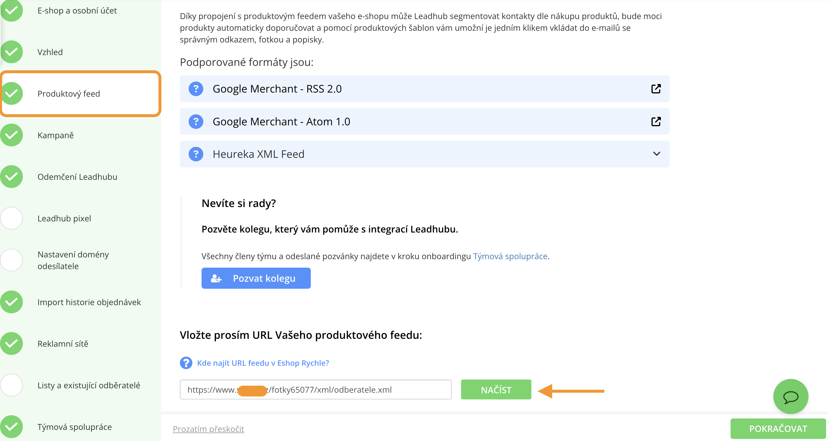 - exportovat produktový feed a registrovat ho do Leadhubu
