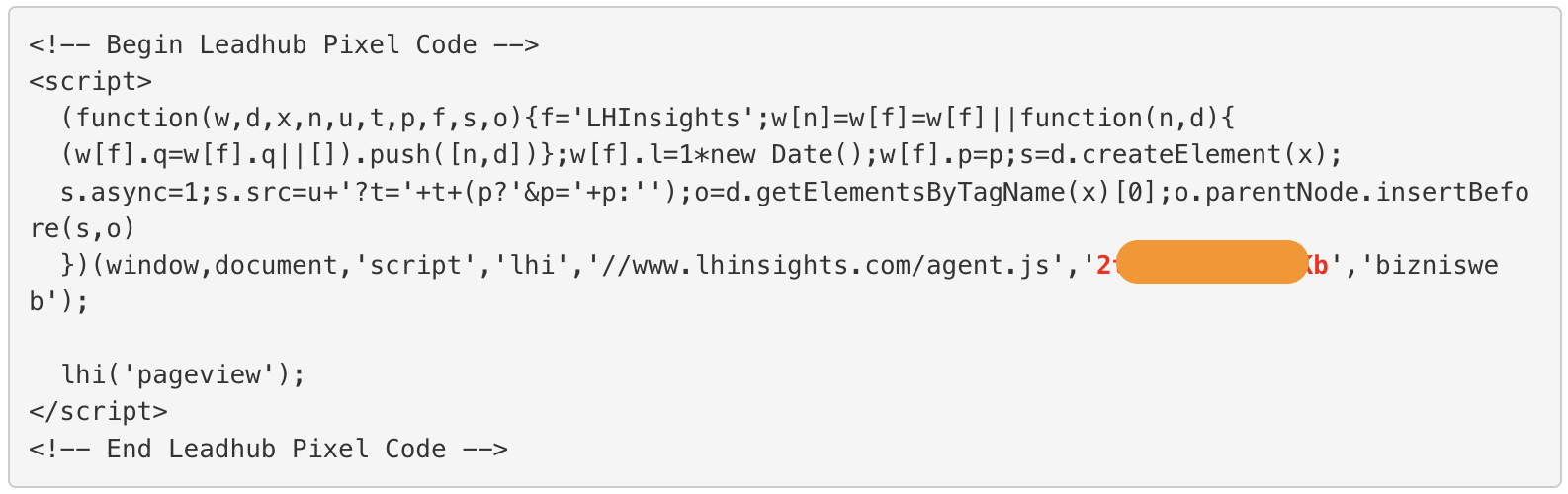 - V administraci platformy přejděte do sekce, která umožňuje vložení kódu do hlavičky všech stránek. Vložte měřící kód, který obsahuje vaše tracking_id, díky kterému Leadhub identifikuje události z vašeho e-shopu.