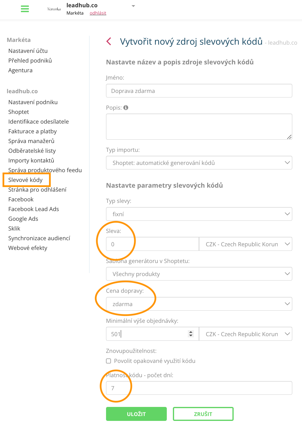 Slevové kódy spravujete přímo v Leadhubu — není tedy nutné přecházet do administrace vašeho e-shopu v Shoptetu.