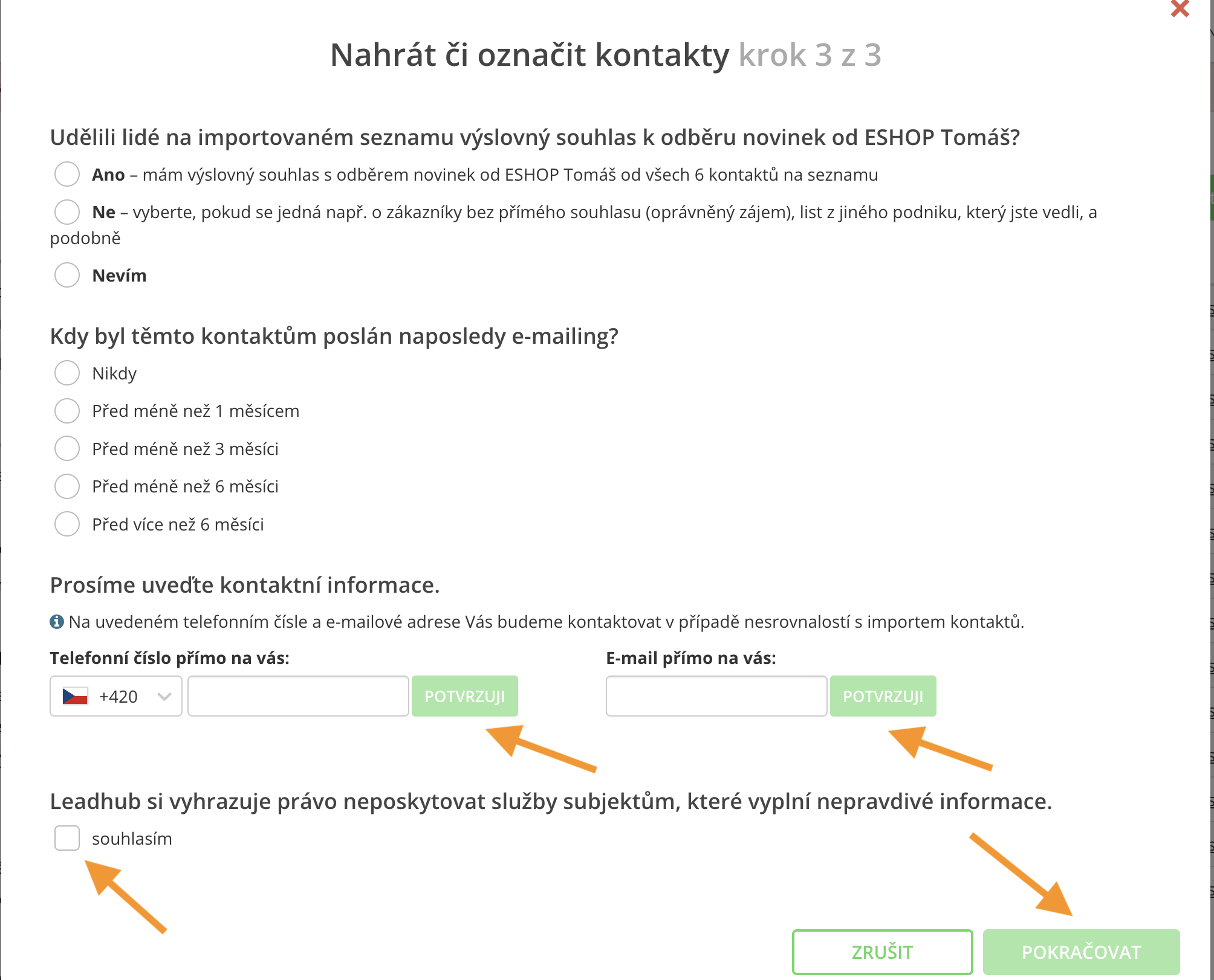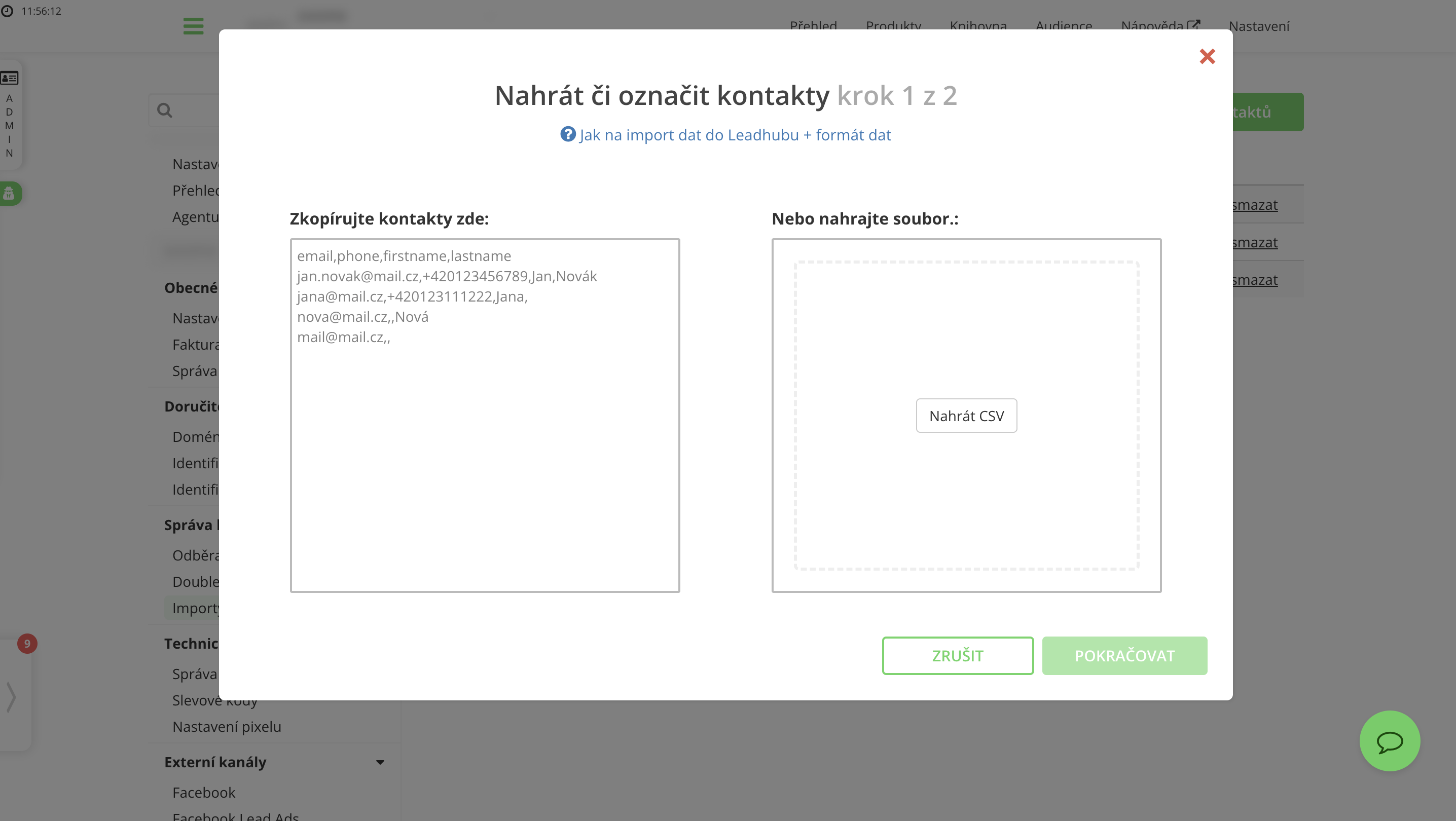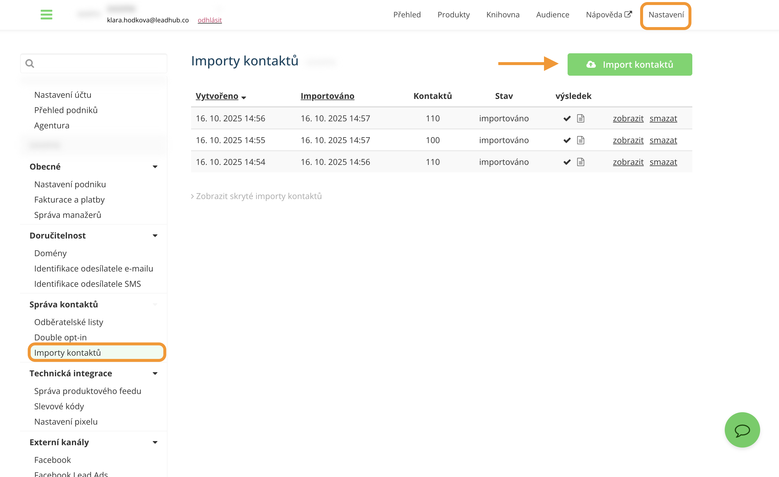 V nastavení účtu v Leadhubu vyberte záložku „Odběratelské listy“. Klikněte na tlačítko „Import kontaktů“ a v pravém horním rohu se zobrazí dialogové okno pro nahrání kontaktů.