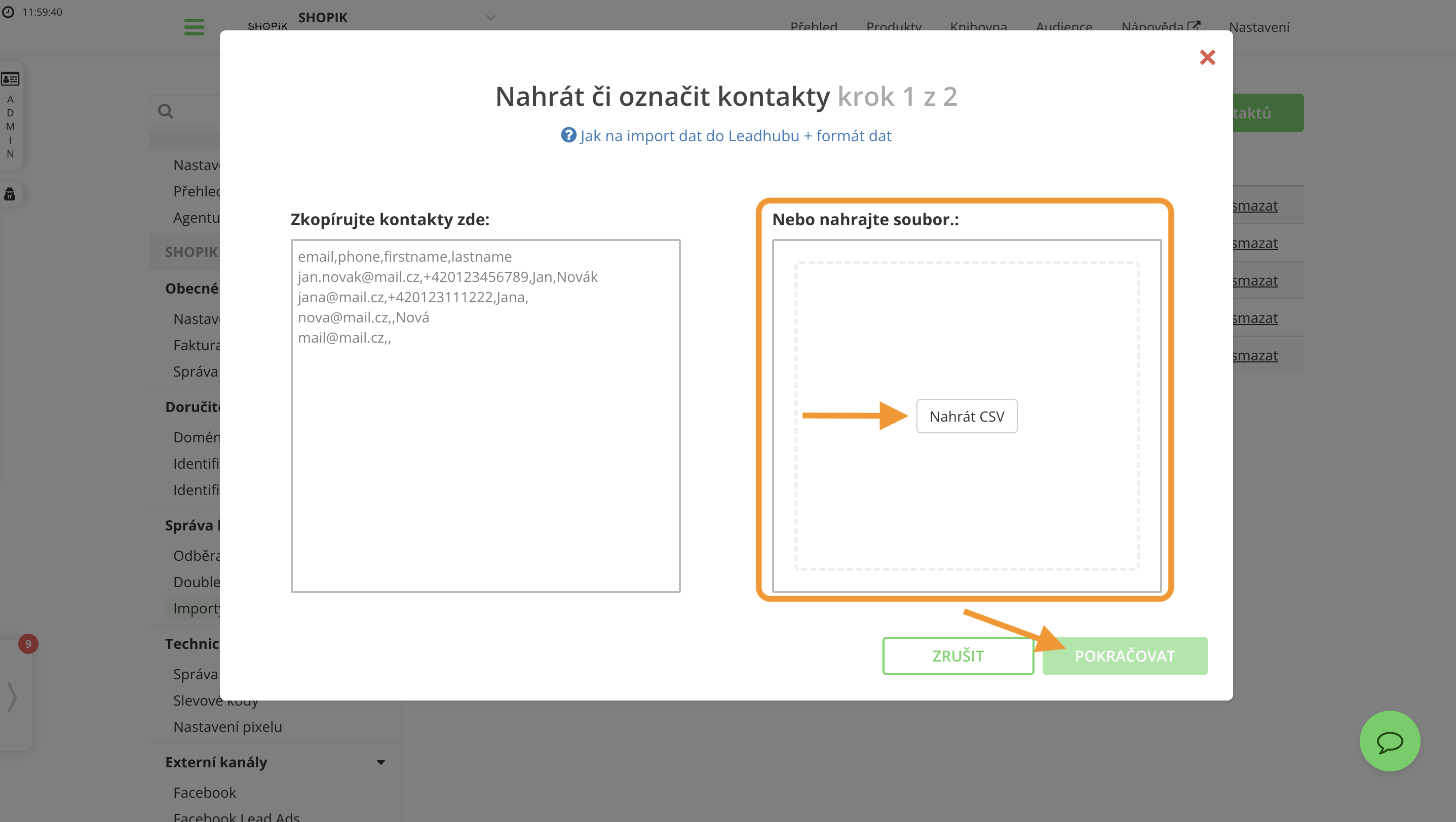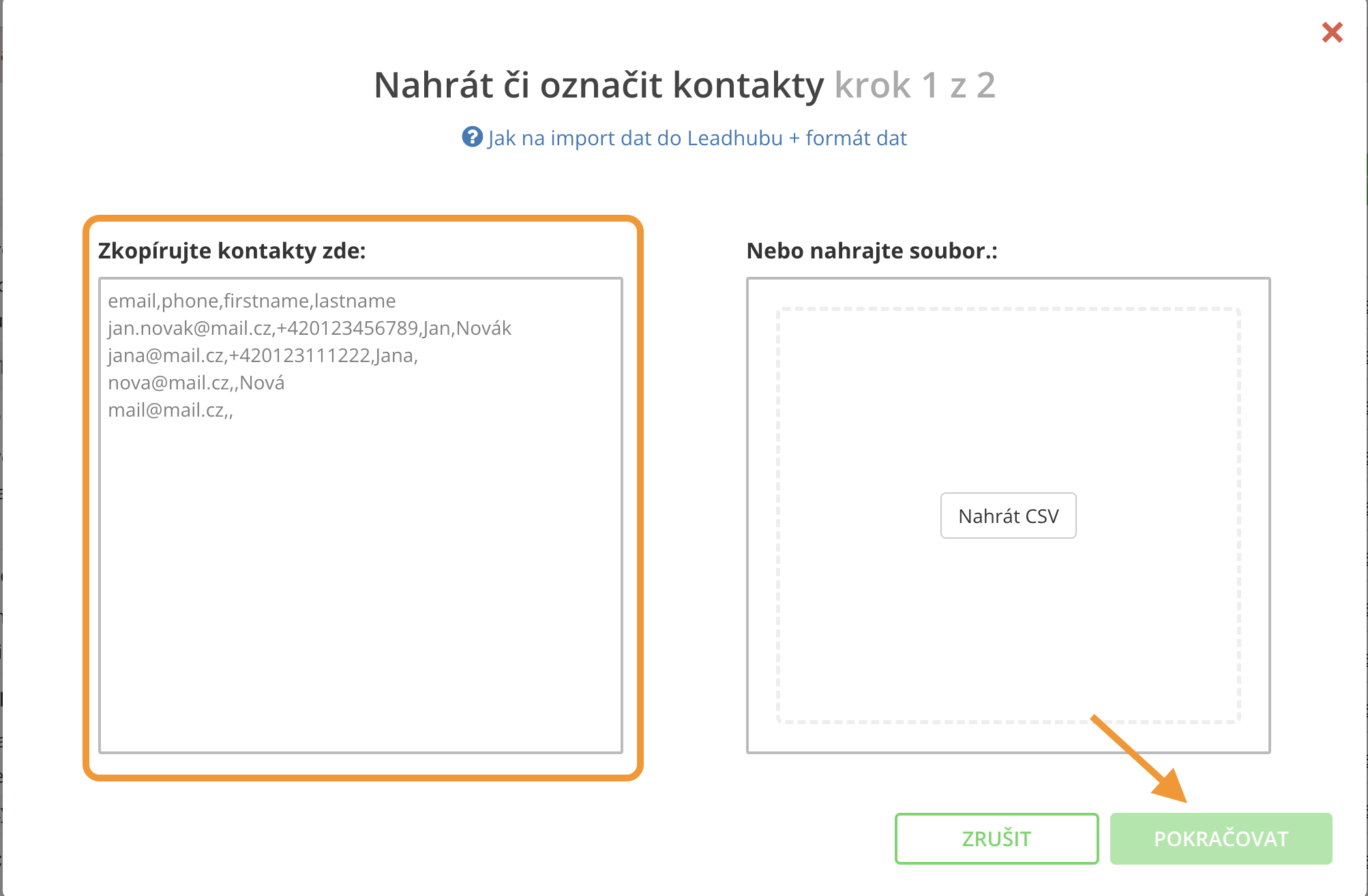 Ve prvním kroku se zobrazí počet importovaných kontaktů a další informace (e-mail, jméno, příjmení atd.), které budou importovány. Nahrajte soubor CSV a klikněte na „Pokračovat“.