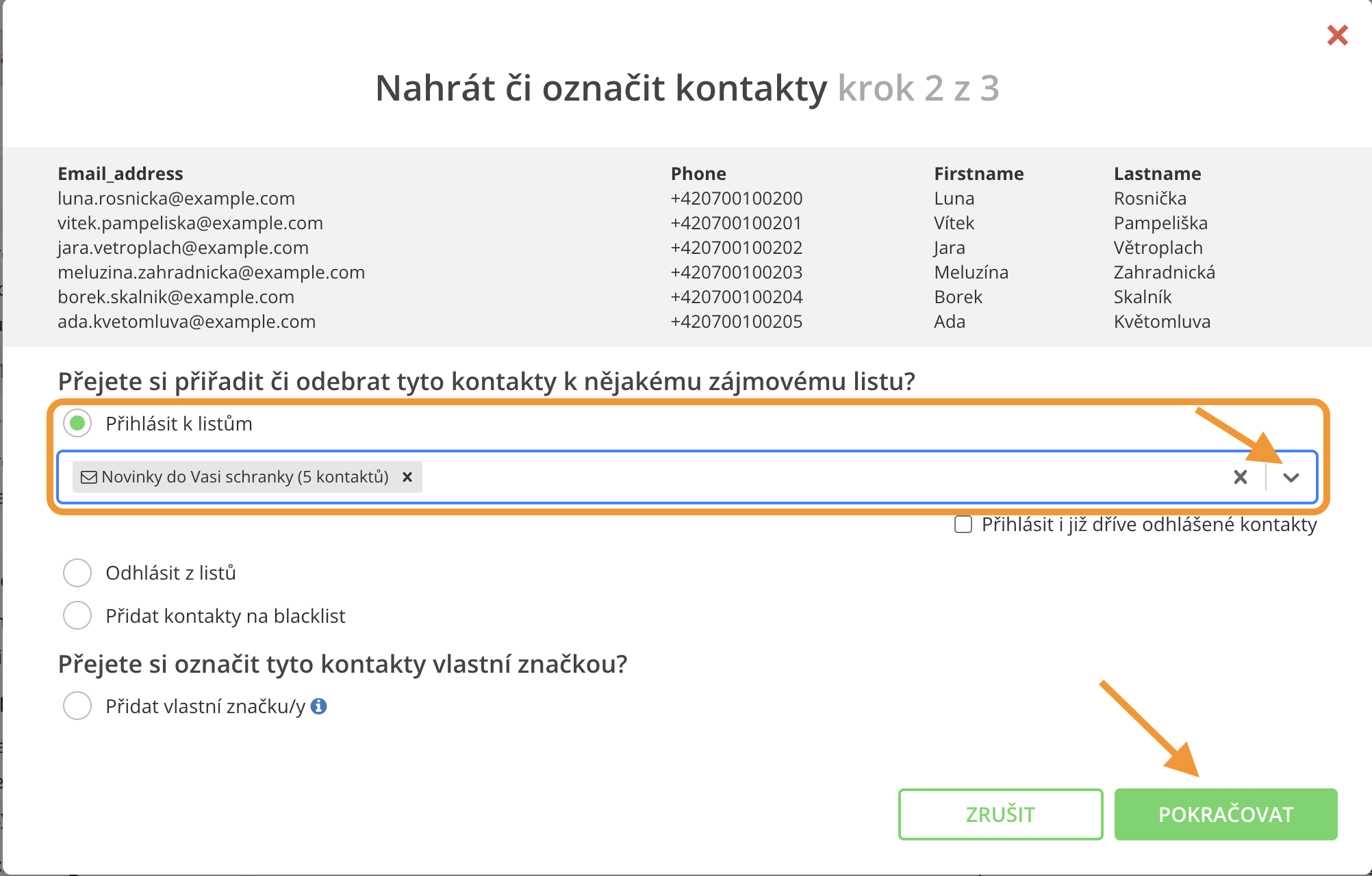 Ve druhém kroku vyberte list, do kterého chcete kontakty přihlásit (nebo odhlásit):