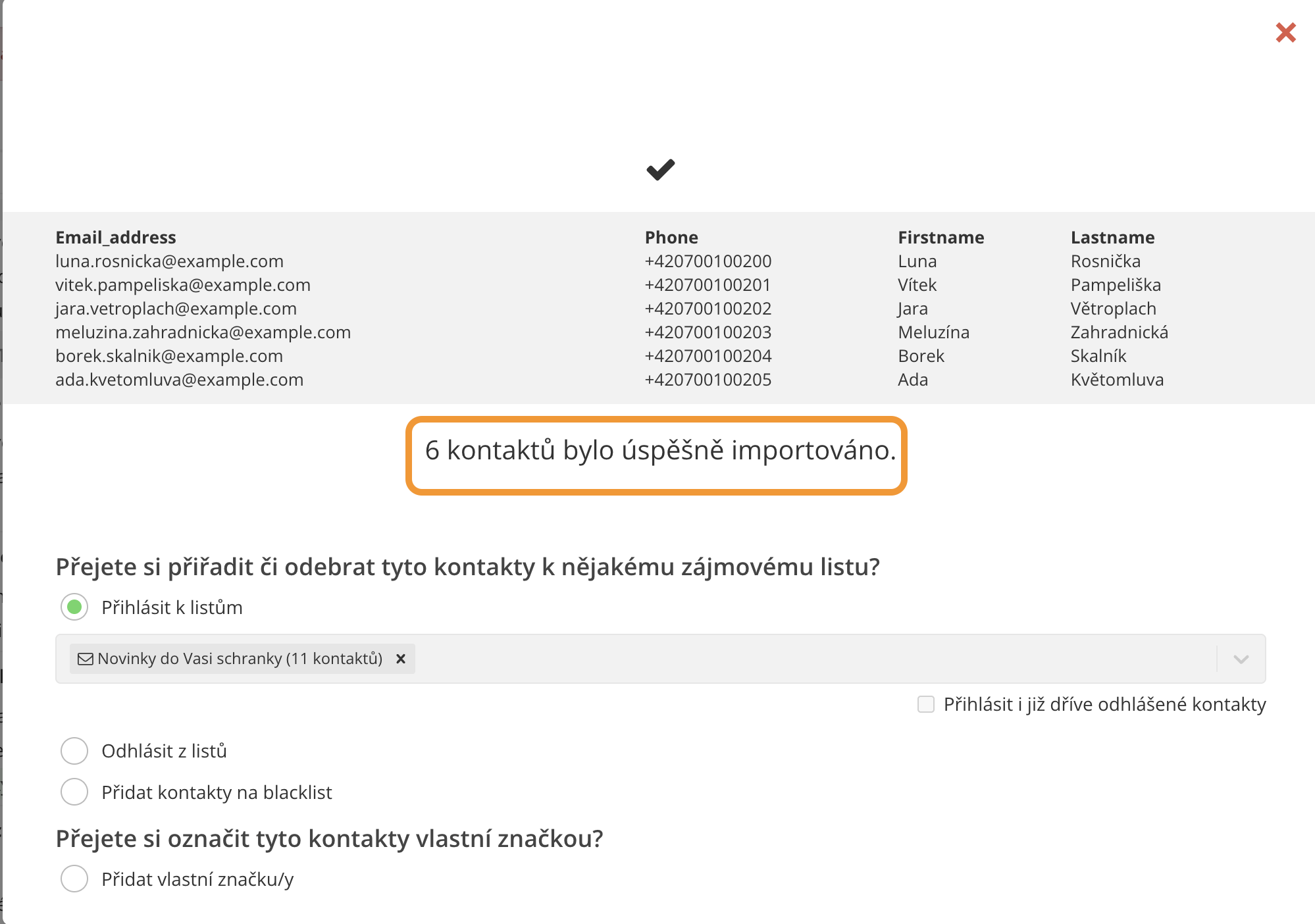 Pokud import kontaktů proběhne úspěšně, zobrazí se následující dialogové okno.