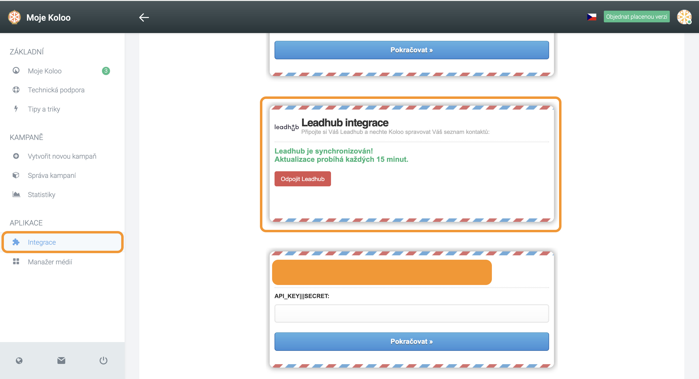 Vložení API klíče 6. Integrace proběhla úspěšně. Nové kontakty se budou do Leadhubu automaticky přenášet každých 15 minut.