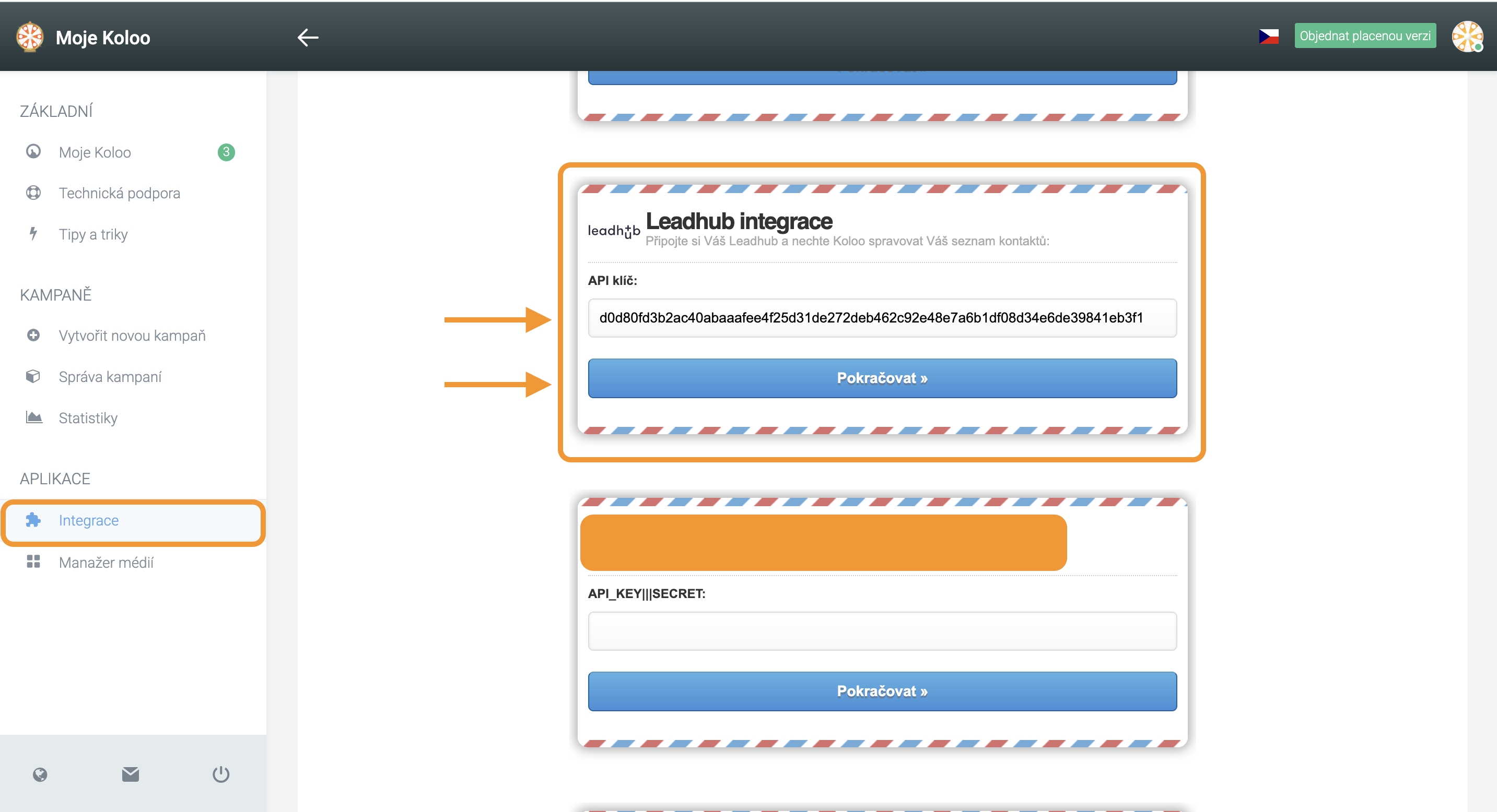 Jakmile obdržíte API klíč, vložte ho do příslušného políčka a klikněte na tlačítko Pokračovat.
