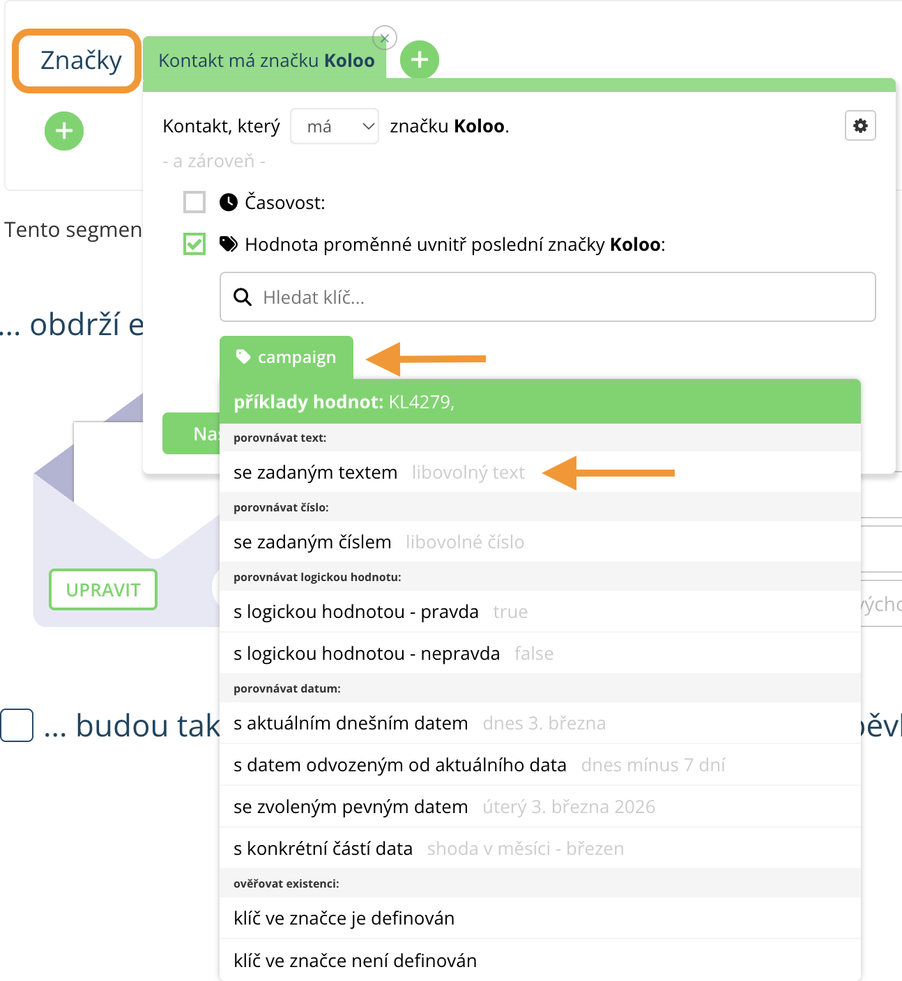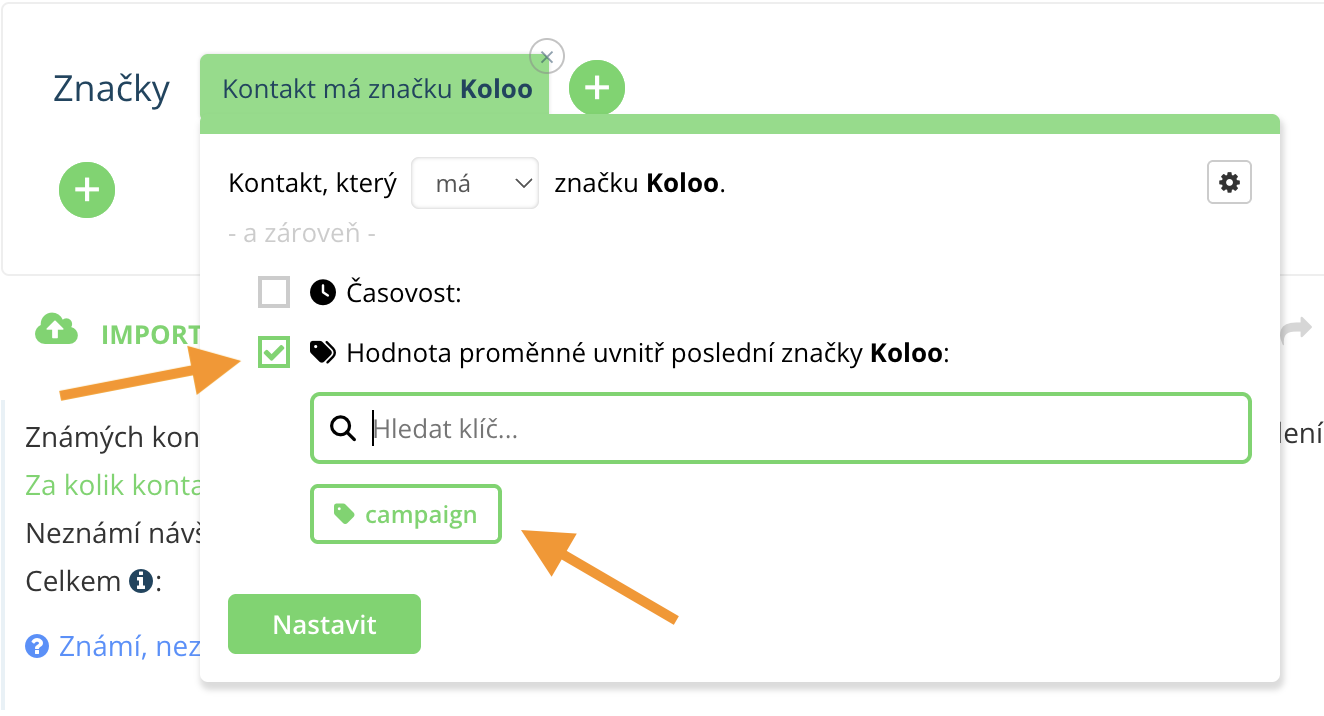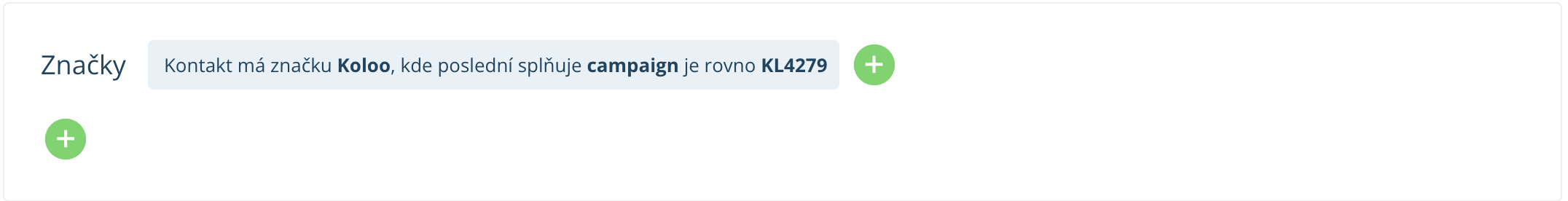 - Nyní je nastavená rozšířená segmentační podmínka Značka – Koloo, která zobrazí všechny kontakty z dané kampaně spuštěné v doplňku Moje Koloo.