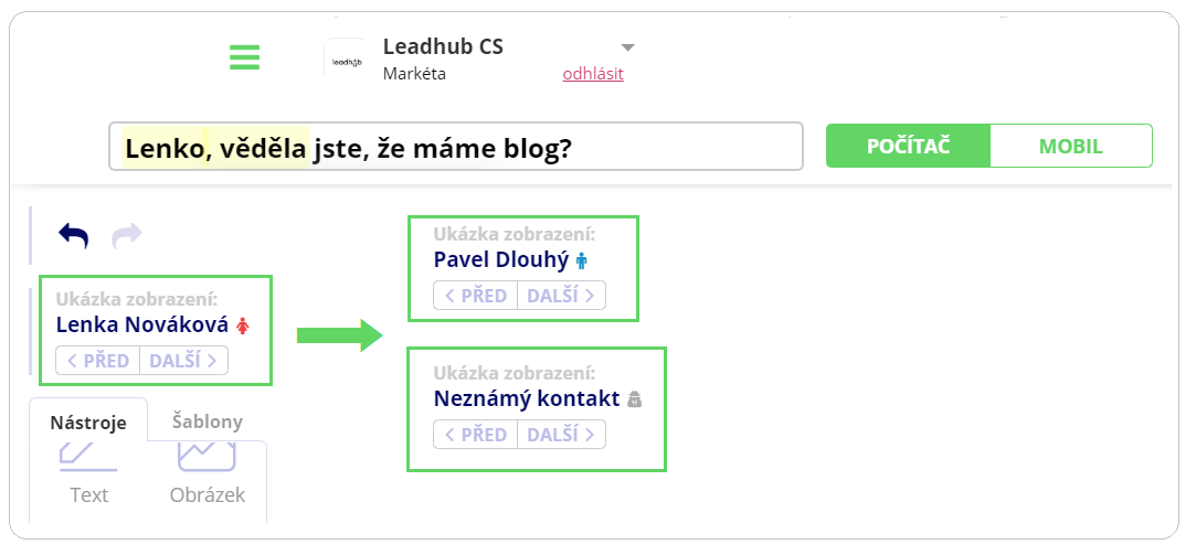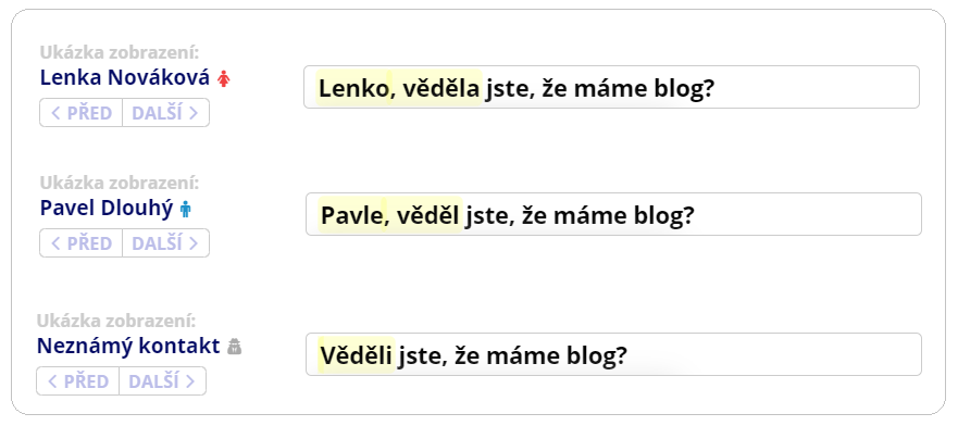 Vždy vyplňte také pole "Text pro neznámé kontakty". Neznámým kontaktem se v tom případě rozumí ten, u kterého je k dispozici pouze e-mail, ale z nějakého důvodu chybí jeho jméno a příjmení. Systém pak nemá možnost rozeznat pohlaví.
