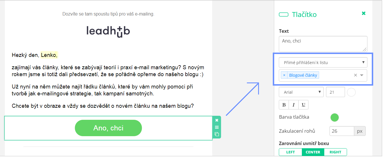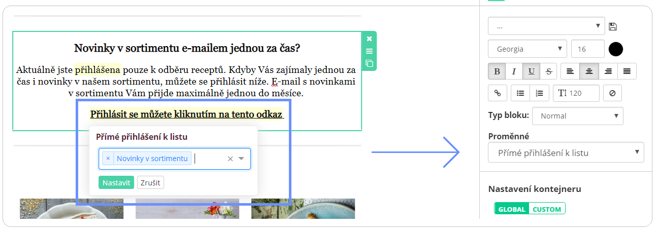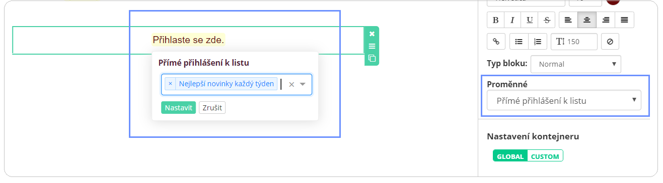 Díky této možnosti můžete s databází pracovat ještě efektivněji a rozsegmentovat si kontakty podle toho, co je doopravdy nejvíce zajímá a posílat jim jen ten nejrelevantnější obsah. Na tlačítko nebo text jednoduše vložíte proměnnou, která bude plnit požadovanou akci - kontakt odhlásí nebo přihlásí do vybraného listu.