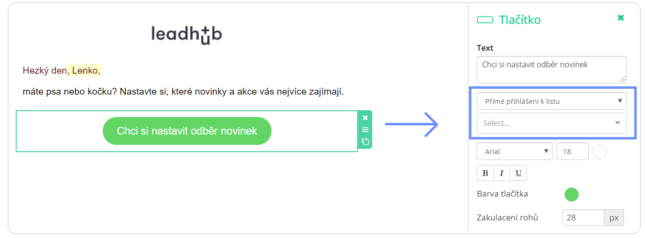 Do Leadhubu jsme přidali nové proměnné hodnoty, které lze vkládat buď jako text, a nebo jako akci přímo na tlačítko.