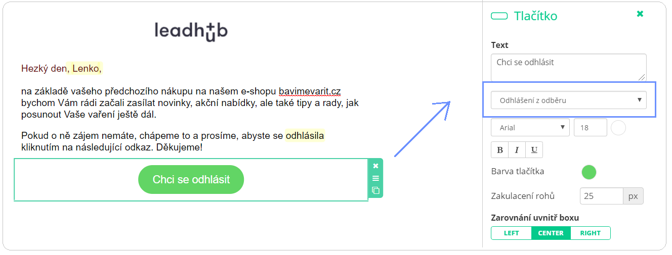 Na tlačítko nebo tech stačí přidat proměnnou "Odhlásit se z odběru". Na pokliknutí na tlačítko bude zájemce ihned odhlášen z databáze, ve které je jeho e-mailová adresa registrován.